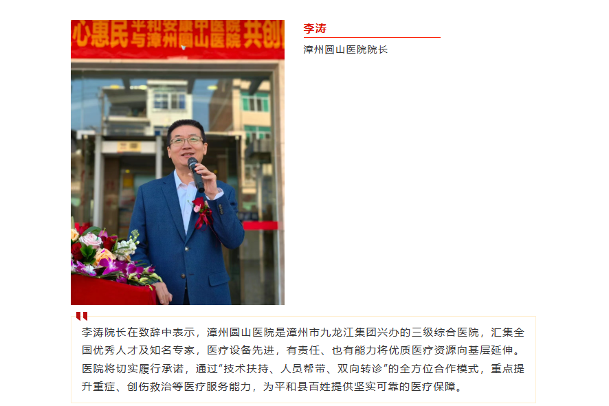 △出席本次仪式的有漳州圆山医院院长李涛、总经理助理林文,平和安康中医院董事长邱家伟、院长许秋水、圆山医院专家团队及安康医院职工。