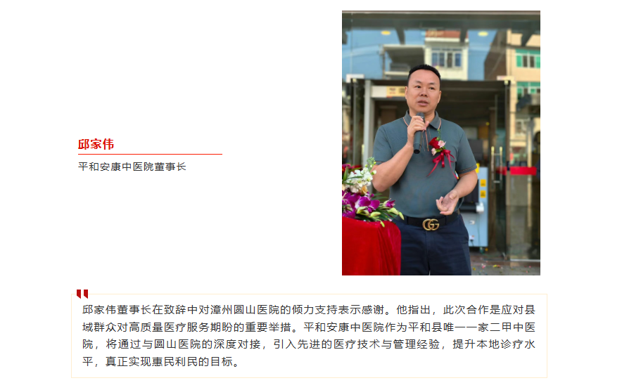 今后,平和县及周边居民可常态化享受到由知名专家提供的优质诊疗服务。这不仅极大便利了群众就医,减轻医疗负担,更是推动县域医疗服务质量整体提升、促进卫生健康事业均衡发展的关键之举。漳州圆山医院将以此次揭牌为起点,持续输送优质医疗资源,与平和安康中医院一道,共同守护平和百姓的健康福祉。
